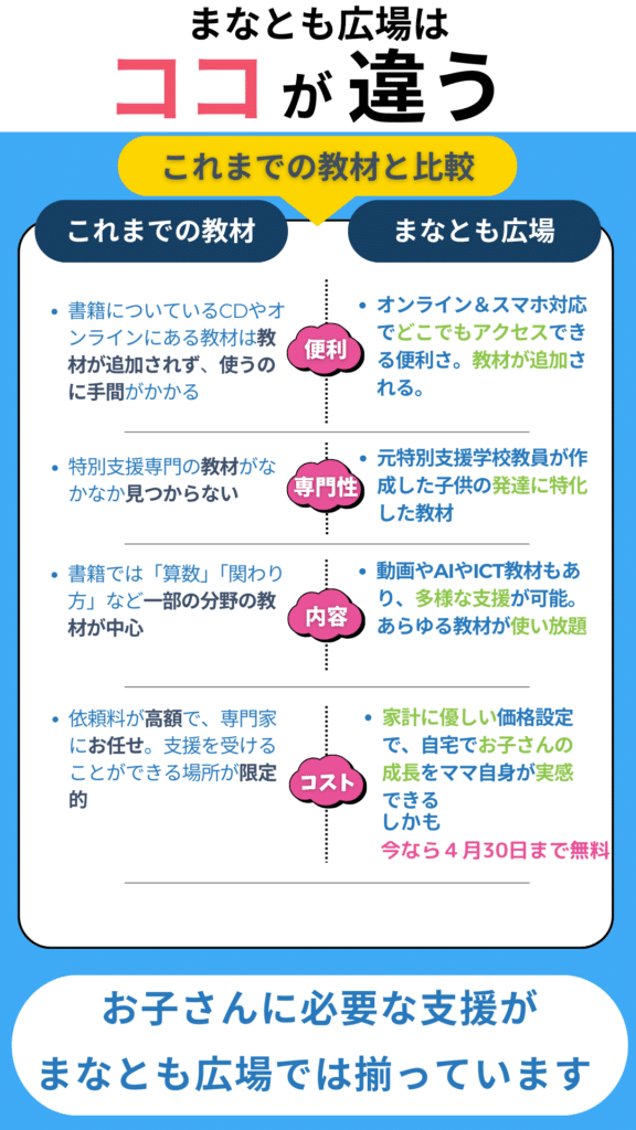 ③教材数や量が豊富なことも強みです。反復学習は大切ですが、同じ教材が続くとどうでしょうか?子供が答えを覚えた「飽き」がきたりするかもしれません。まなとも広場では、教材数やボリュームが多いので、身に付けた力がちゃんと定着できているのかを確認しやすくなっています。