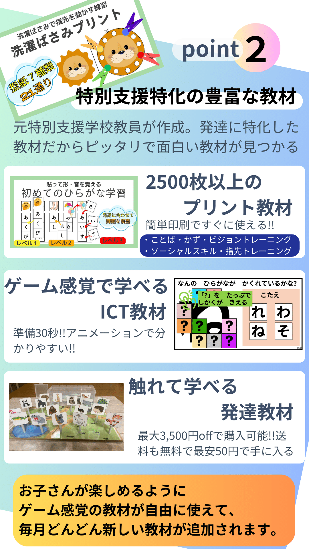 ①元特別支援学校教員が運営しているため現場で使える特別支援教材に特化している